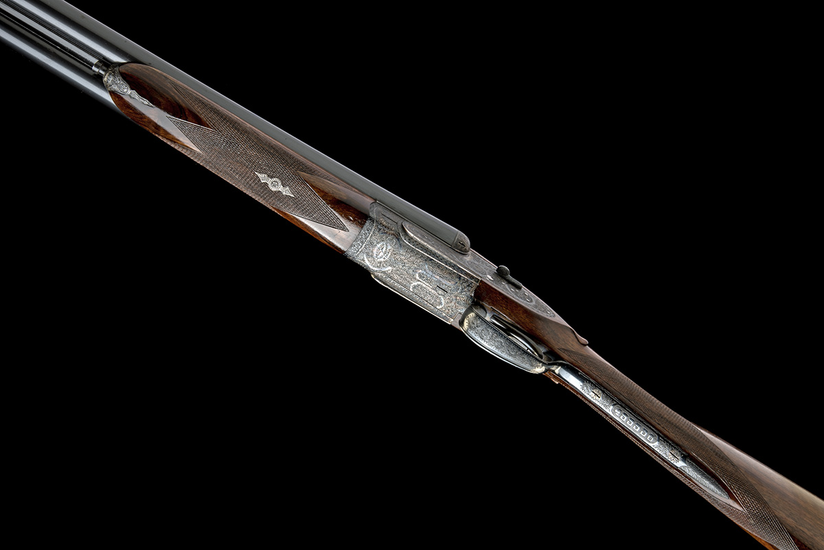 for 1973, 27in. nitro chopperlump barrels, 2 3/4in. chambers, bored approx. 1/4 and 1/2 choke, removable striker discs, automatic safety with gold-inlaid 'SAFE' detail, hand-detachable sidelocks, gold-inlaid cocking-indicators, articulated front trigger, rolled-edge triggerguard, acanthus scroll and floral bouquet engraving, retaining virtually all its original colour-hardening and finish, 14 1/4in. stock, weight 6lb. 9oz., together with its original proof certificate and pamphlet