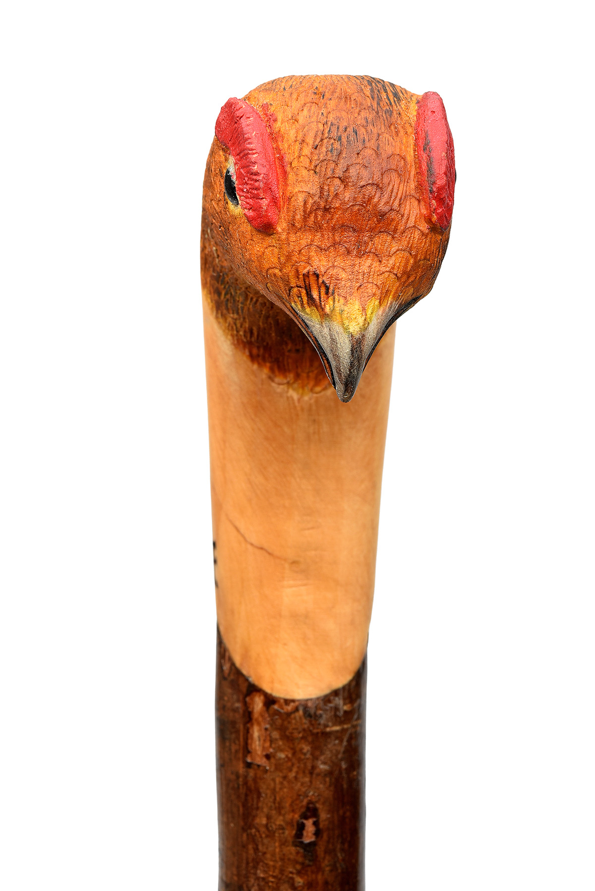 measuring approx. 53 1/2in. in length, with hardwood shaft, the head carved and painted in the form of a red grouse