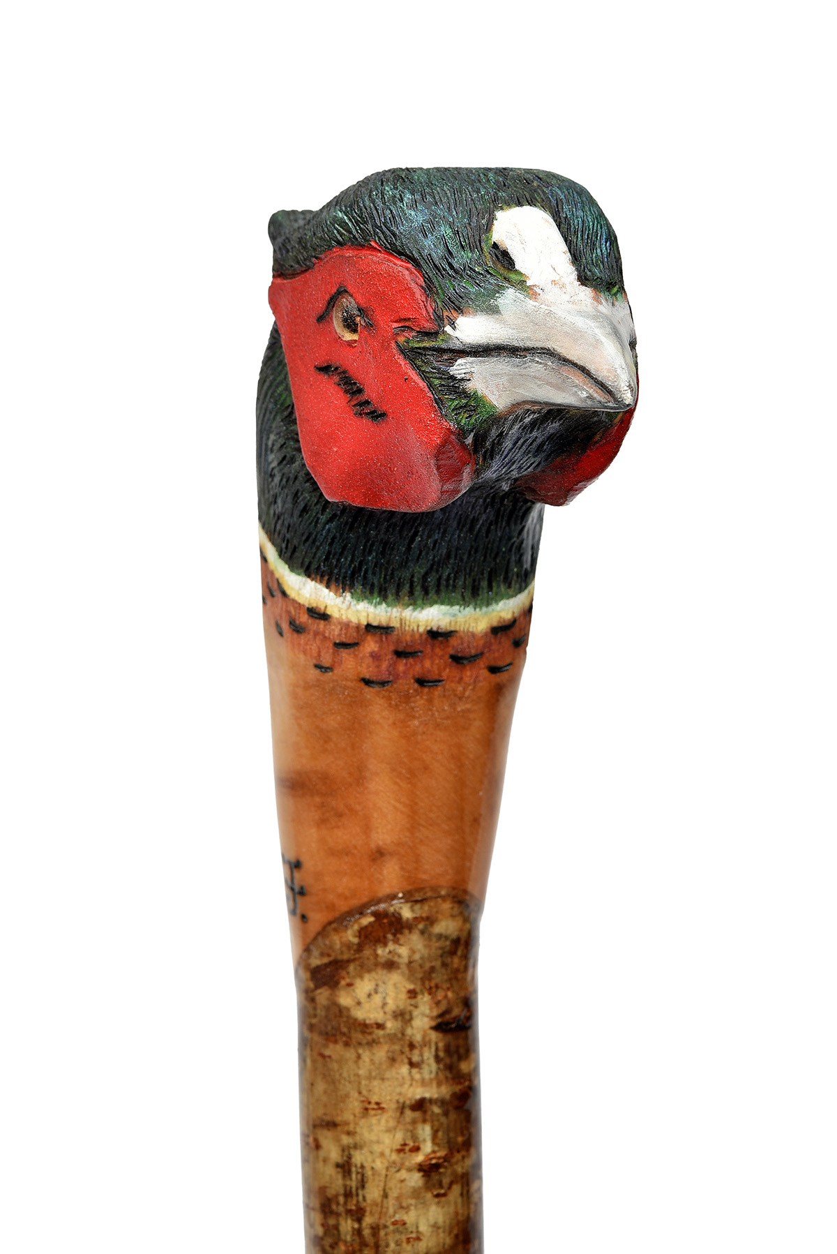 measuring approx. 51 1/2in. in length, with hardwood shaft, the head carved and painted in the form of a cock pheasant