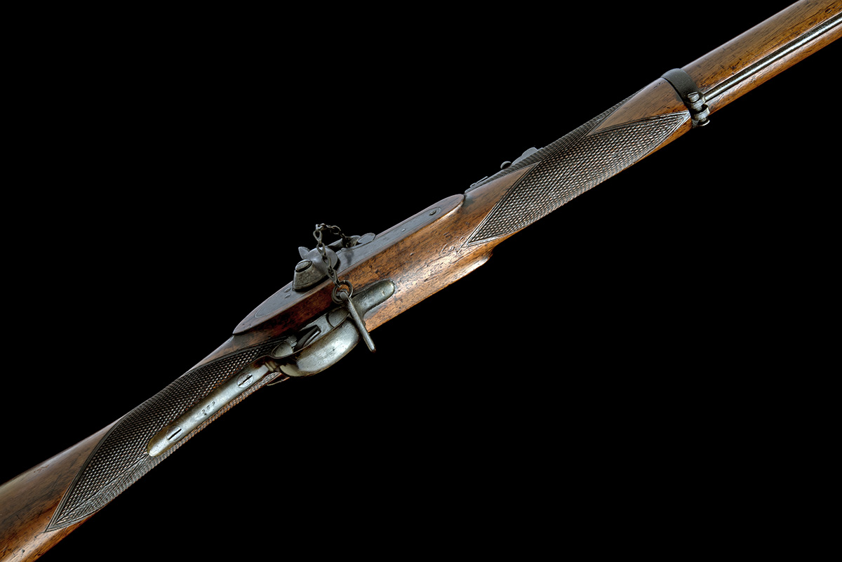 circa 1860, with ordnance proved three-groove rifled 33in. barrel signed 'MURCOTT' together with the serial number on the top of barrel, block and blade fore-sight, elevating ladder rear-sight, small 'L.A.C.' stamp at breech, cheese-head tang-screw, colour hardened borderline engraved unsigned lock and hammer, chequered walnut full-stock with blacked brass furniture except for three iron barrel-bands, the tang also marked with the serial number and blacked jag-headed iron ramrod, fair amount of finish throughout, fitted with a chained nipple protector