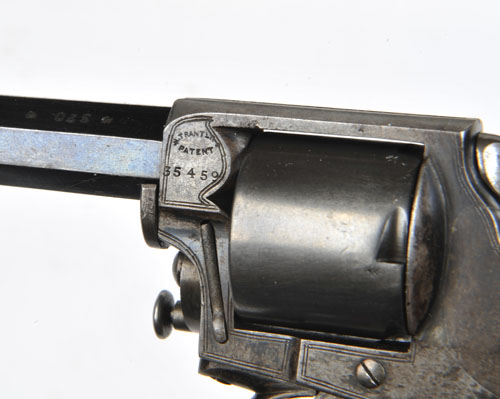 * A CASED .32 (S&W) FIVE-SHOT DOUBLE-ACTION POCKET REVOLVER SIGNED 'W. RICHARDS, LIVERPOOL' MODEL 'TRANTER'S PATENT', serial no. 35459, circa 1870, with 3in. blued octagonal sighted barrel engraved with a band of foliage at the muzzle and signed 'W. RICHARDS OLD HALL ST. LIVERPOOL', grooved top-strap, border engraved frame marked 'W. TRANTER'S PATENT' and retaining traces of blued finish, chequered walnut butt, patent hinged extractor rod, Birmingham proof marks, in fitted mahogany case lined in blue baize (some partitions loose), probably original, the lid with circular brass escutcheon.