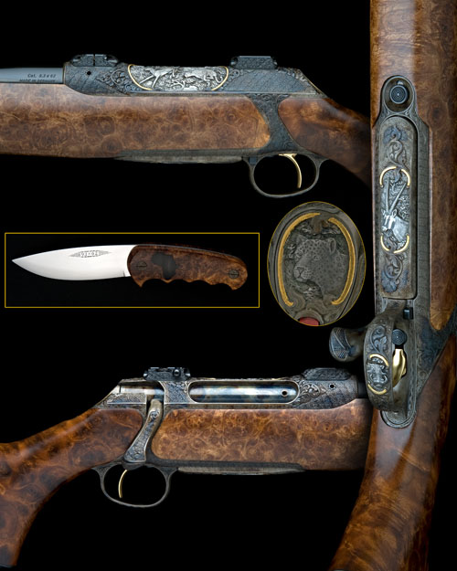 24in. blued nitro barrel, scroll engraved case-hardened ramp-mounted bead fore-sight with flip-up moon-sight, scroll engraved case-hardened block-mounted single standing leaf rear-sight, case-hardened receiver engraved en suite signed on each side 'SAUER 202 EXKLUSIV WAFFEN GROIS' and chiselled on the side-wall with a forest scene involving two antelope being chased by a cheetah, the scene bordered by gold lines, the rear of the bolt chiselled with a leopard-mask bordered by gold lines, fitted with a Zeiss 'Diavari' 2,5-10x50 T* Victory telescopic sight in quick detachable mounts, the scope rings engraved en suite with the receiver, gold-washed set trigger, 14 1/4in. highly figured burr walnut unchequered pistolgrip stock including 3/8in. rubber butt-pad, raised cheek-piece inlaid with a dark horn map of Africa, case-hardened trigger-guard engraved en suite with the receiver and chiselled with the mask of a warthog, the case-hardened base of the detachable box-magazine chiselled with the portrait bust of a Kudu, dark horn fore-end cap, sling mounts, in universal case with serial numbered stainless steel drop-point full-tang knife engraved '9.3X62' and with burr walnut grip-scales. This rifle appears to be in as new condition.