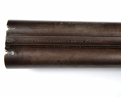 30 7/8in. rebrowned twist sighted barrels signed 'TRULOCK & HARRISS (sic), 9. DAWSON ST. DUBLIN', border and scroll engraved action and back-action locks, the latter each signed 'TRULOCK & HARRISS' and decorated with a differing game scene (one hammer repaired), 14 1/4in. figured stock with chequered grip and fore-end (fore-end tip missing), border and scroll engraved mounts.