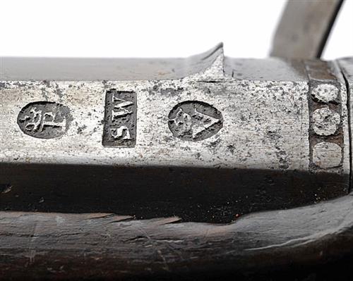 late 18th century, with 11in. swamped octagonal sighted barrel engraved with a band of beadwork at the breech (brushed bright, fore-sight missing), border and foliate engraved tang and lock, the latter with stepped-tail, roller and signed 'WALLACE' (some wear to engraving, hammer repaired), walnut full stock with flat-sided butt (stock cracked through and repaired, fore-end and butt replaced), silver mounts including trigger-guard engraved with a bouquet on the bow and with acorn finial, silver escutcheon engraved with the initials 'RJ', and later horn-tipped ramrod (some pitting to lock), Birmingham private proof marks, barrelsmith's mark 'SW' for Samuel Wallace, Dublin.