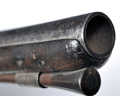 circa 1780, with 9 1/2in. swamped barrel signed 'WOGDON LONDON' on the short sighting-flat and engraved with band of beadwork at the breech, foliate and border engraved tang, flat bevelled lock signed 'WOGDON' (cock replaced), walnut full stock (cracked and repaired beneath lock, cracked in front of the trigger-guard and in the ramrod channel) carved in low relief with a shell behind the barrel-tang, silver mounts including spurred pommel and trigger-guard with acorn finial, large silver escutcheon, and later ramrod (some wear throughout, iron parts with some pitting), Tower private proof marks.