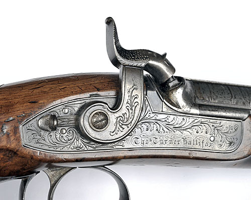 circa 1825, with 10 1/4in. twist sighted barrels each with concave sighting flat, border and scroll engraved breeches each with short gold-inlaid line, border and scroll engraved tangs and bolted locks, the latter each signed 'THOS. TURNER HALIFAX', figured walnut half-stocks each with chequered butt (one butt cracked through and repaired), silver escutcheons, barrel-bolt escutcheons and fore-end caps, border and scroll engraved trigger-guards, and brass-tipped ramrods, one with worm (some pitting to barrels, iron parts discoloured), Birmingham proof marks, in associated lined and fitted case with accessories including flask and iron pincer-type bullet-mould.