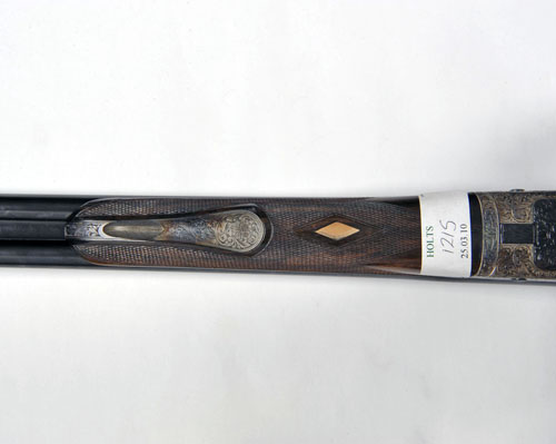 21 1/8in. nitro chopperlump barrels with chequered and acanthus scroll engraved sight rib, flip-up open sights and ramp-mounted bead foresight with protecting hood, the breech end mounted with a K. Kahles Helia Super telescopic sight in quickly-detachable mounts, sunken rib engraved 'GEORGE GIBBS. BRISTOL & 35, SAVILE ROW. LONDON. W.', treble-grip action with elongated action, intercepting sears, removable striker discs, automatic safety with gold-inlaid 'SAFE' detail, filed triggers, the action and furniture profusely engraved with bold acanthus scrollwork, surrounding and invading central strapwork banners engraved with the makers name, retaining virtually full colour-hardening and finish, 14 1/2in. highly-figured pistolgrip stock with engraved steel pistolgrip-cap (with trap), sling swivels and chequered steel buttplate, fore-end with fully engraved grip-catch release lever and gold diamond-shaped escutcheon, weight 8lb. 5oz., in its fully fitted brass-cornered leather case with provision for the telescopic sight and with leather cased 'optical sights'.