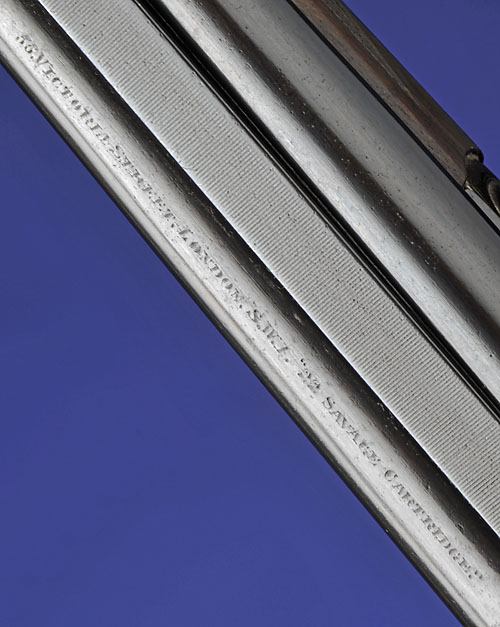 24in. nitro chopperlump barrels with matt sight rib, open sights and folding leaf sights for 100, 200 and 300 yards, ramp-mounted bead foresight with flip-up moonsight, , tubes engraved 'WEBLEY & SCOTT LTD. 55 VICTORIA STREET, LONDON, S.W.1.' "22 SAVAGE CARTRIDGE", the rib engraved 'SHOT AND REGULATED BY WILLIAM EVANS, GUN & RIFLE MAKERS, 63 PALL MALL, ST. JAMES'S, LONDON, S.W.', treble-grip action with removable striker discs, automatic safety, border engraving, some external pitting, retaining some renewed blued finish, 14 1/4in. pistolgrip stock including wooden buttplate, sling swivels,fore-end with grip-catch release lever, weight 7lb. 4oz.