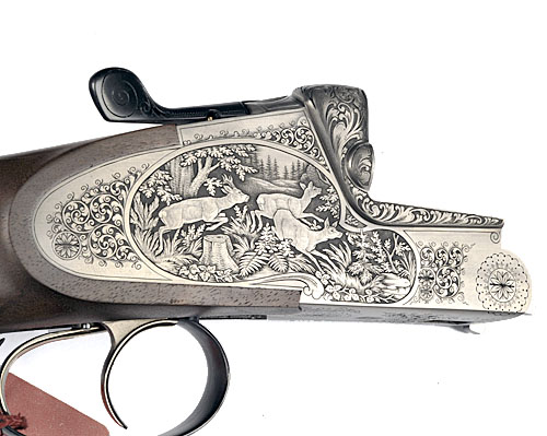 25in. nitro barrels with raised matt top-rib, folding open sights and ramp-mounted bead foresight, 3in. shot chamber, bored approx. 3/4 choke, bolstered treble-grip action, hold-open toplever, manual safety, sprung cocking lever, gold cocking indicators, set front trigger, carved with acanthus scrollwork on a matt background surrounding vignettes of running deer and foraging boar, both set against their naturalistic habitat, 14 1/4in. well-figured pistolgrip stock including buttplate, sculpted cheekpiece, sling swivels, weight 8lb. 11oz., in a full length universal case