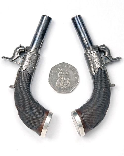 circa 1840, with 1 1/4in blued micro-rifled turn-off barrels, foliate and border engraved side panels signed 'CLARKE', the opposite 'LONDON', dolphin engraved central hammers, sliding safes on the tangs, finely chequered walnut pistol-grips with diamond-shaped silver escutcheons to the backs, silver oval escutcheons and banding to the bases, concealed triggers, Birmingham proofs, each pistol measuring under 4in in length (actions brushed bright, much original colour on the remainder)