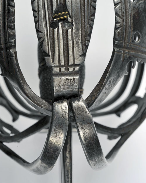first half of the 18th century, possibly for issue to an English Horseman, with 33in double-edged blade, two short, narrow fullers at the ricasso flanking a wide central fuller running for one third of the blade length, terminating in a blade makers mark of two intertwined 'C's', complex steel basket with panels featuring typical pierced decoration, wire bound sharkskin grip (a later sympathetic replacement) and bun-shaped pommel (some discolouration to hilt, blade cleaned and polished)
