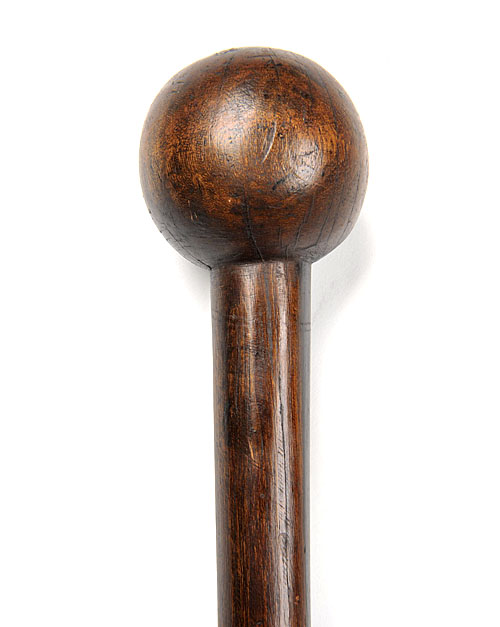 both mid to late 19th century, the first of standard form with 31in shaft terminating in a spherical head of just over 2 1/2in diameter (one old, age crack) the second with tapered leaf form blade secured to shaft by a patterned reed binding, 46in overall