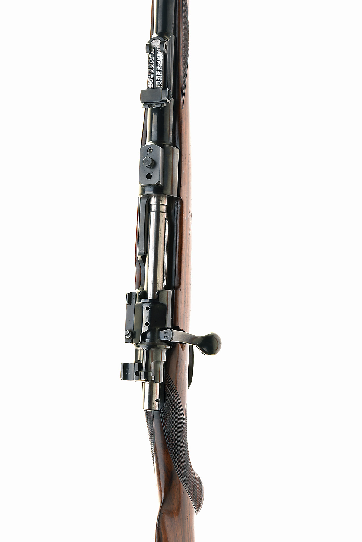 ** MAUSER 6.5X57 BOLT-MAGAZINE SPORTING RIFLE, serial no. 96616, circa 1920, 25 3/4in. nitro reproved replacement barrel (in 2025), with tangent rear sight graduated from 50 to 1000 metres, ramp-mounted bead foresight, receiver (with thumb cutout) tapped for telescopic sight bases, lever type hinged floorplate, figured three-quarter length pistolgrip stock with 14 1/4in. pull, chequered grip and fore-end, cheekpiece, blued steel pistolgrip-cap, sling swivels and Mauser horn buttplate, small insert repair to toe, stock with circular escutcheon engraved 'M', weight 7lb. 6oz.