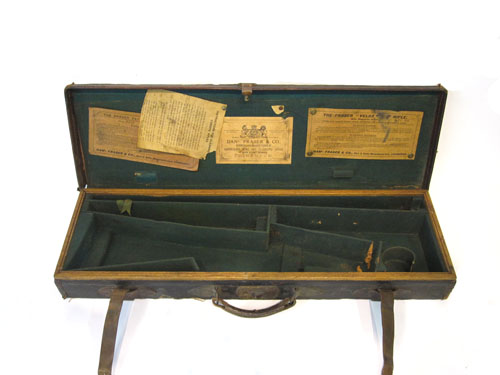 A CANVAS & LEATHER SINGLE HAMMERGUN CASE, fitted for 30in. barrels, lined with green baize, brass lock (key missing), handle good, straps missing.
