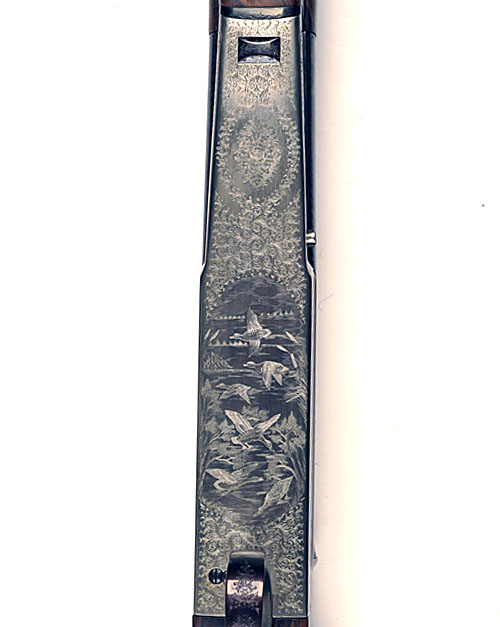 26 3/4in. Boehler Antinit-steel nitro barrel with ventilated concave matt top-rib, 2 3/4in. chamber, bored approx. 1/4 choke, hold-open toplever, manual safety, action finely engraved with floral bouquets and acanthus scroll work, with game scenes of hare, pheasant and duck, signed 'Patelli. W. 78', bright and blued finish overall, 14 1/8in. figured pistolgrip stock, sling swivels, weight 8lb. 2oz., in its leather case with original certificate of proof