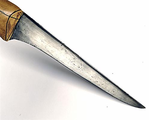early 18th century, with laminated straight 7in. blade of 'T' section (some cleaning), plain walrus ivory hilt of pesh-kabz form TOGETHER with its original walrus ivory scabbard with hooked tip and two naively carved decorative bands (some age cracking and minor chipping to ivory)