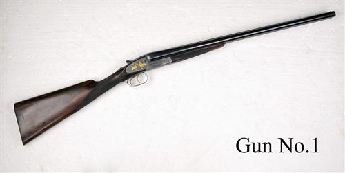 25in. nitro chopperlump barrels with Churchill ribs gold-inlaid 'XXV' and '1 and '2', with the tubes engraved 'CHURCHILL (GUNMAKERS) LTD. 7. BURY STREET. ST. JAMES'S. LONDON. ENGLAND' and with flashes of scroll engraving at the breech ends, 2 3/4in. chambers, bored approx. imp. cyl. and 1/4 choke (both), Baker-patent self-opening actions, toplevers gold-embossed with a portrait of a spaniel, manual safeties with gold-inlaid 'SAFE' details, gold-inlaid arrow cocking-indicators, gold-washed internals and triggers, double rolled-edge triggerguards, fine acanthus scroll engraving surrounding a banner gold-inlaid 'CHURCHILL' and with gold-highlighted vignettes of hounds retrieving fallen game on the left, the right with a brace of woodcock in flight, the underside with gold script of the model designation, 14 3/4in. figured stocks, weight 6lb. 3oz. (both), in their individual black leather cases gold-embossed '1' and '2' respectively