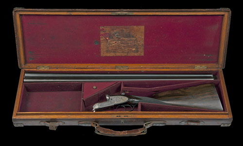 30in. nitro reproved Krupp-steel barrels, rib engraved 'EDWINSON GREEN & SONS. MAKERS. CHELTENHAM & GLOUCESTER', 2 1/2in. chambers, bored approx. 1/4 and 3/4 choke, automatic safety with gold-inlaid 'SAFE' detail, best fine bouquet and scroll engraving, brushed bright and reblued finish overall, 14 1/2in. figured stock, weight 6lb. 13oz., in a brass-cornered oak and leather case with Blissett trade label