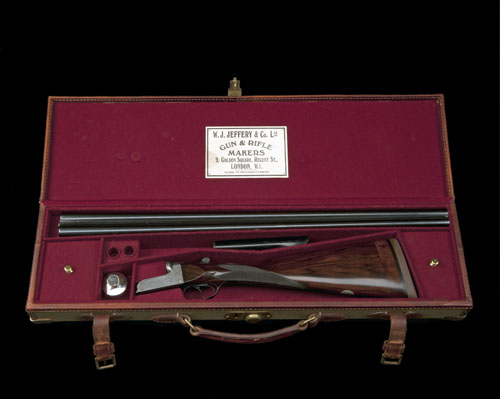 28in. nitro barrels, rib engraved 'W.J. JEFFERY & CO. LTD. 9. GOLDEN SQUARE. REGENT STREET. LONDON.', 2 1/2in. chambers, bored approx. true cyl. and 3/4 choke, some internal pits, treble-grip action, automatic safety, beaded border and bold scroll engraving, brushed and blued finish overall, 14 5/8in. figured stock including 1in. wooden extension and 3/4in. rubber recoil pad, weight 5lb. 14oz., in a brass-cornered canvas and leather case with some accessories