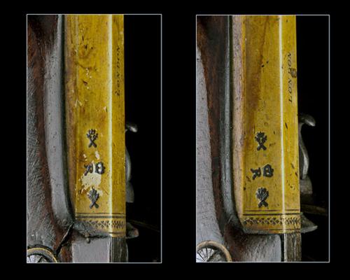 circa 1795, with slightly swamped octagonal 10in. barrels, the top-flat signed 'LONDON', private proofs, engraved band at breech, solid iron florally engraved tangs (one top-nail replaced), slightly curved bevel edged step-tailed lockplates with border engraving and signed 'J W' over 'RICHARDS' forwards of the hammers, roller frizzens, plain walnut full-stocks (one cracked through and repaired at fore-end, the other cracked at side-nail and beneath lock), bag-shaped grips, brass furniture (one trigger-guard replaced) and replacement ramrods
