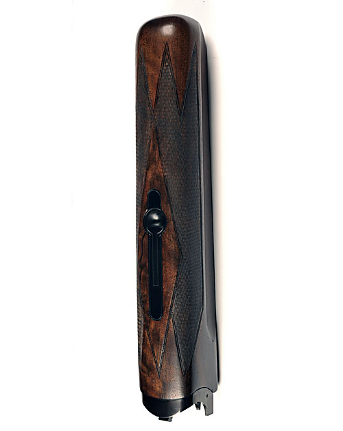 27 1/2in. (70cm) ported nitro barrels with 11mm ventilated matt top-rib, 2 3/4in. chambers, skeet chokes, hold-open toplever, manual safety with integral triggerplate release catch, blued border engraved action, 14 1/2in. replacement pistolgrip stock with adjustable comb and including 1/2in. rubber recoil pad, replacement fore-end wood, catch at fault , weight 8lb. 4oz., in a universal case