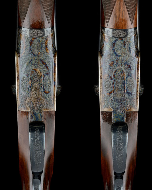29in. reproved sleeved chopperlump barrels (in 2012), tapered broad raised matt ribs gold-inlaid '1' and '2', 2 3/4in. chambers, bored approx. 1/2 choke in all, Holland & Holland style self-opening systems, toplevers gold-inlaid '1' and '2', automatic safeties, cocking-indicators, non-selective single triggers, fine bouquet and scroll engraving, the undersides with 'FABBRI. BRESCIA', the triggerplates signed 'F. Iora. Inc.', retaining virtually full original colour-hardening and finish, 14in. boldly-figured stocks, weight 7lb. 1oz., in their lightweight leather motor case