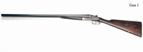 28in. nitro barrels (No.1 replacement by another, No.2 original chopperlump, No.2 wall thicknesses below recommended minimum), the ribs gold-inlaid '1' and '2' at the breech ends, 2 1/2in. chambers, bored approx. imp. cyl. and 1/2 choke (No.1), toplevers gold-inlaid '1' and '2', automatic safeties with gold-inlaid 'SAFE' details, removable striker discs, cocking-indicators (No.2 gold-inlaid), fine bouquet and scroll engraving surrounding scenes of pheasant and partridge in their naturalistic habitats, the undersides engraved with the makers name, the triggerguards engraved with a hound retrieving fallen game, 15 1/2in. figured stocks including 1 1/4in. wooden extensions, weight 6lb. 8oz. (No.1) 6lb. 3oz. (No.2), in their makers leather motorcase with canvas outer