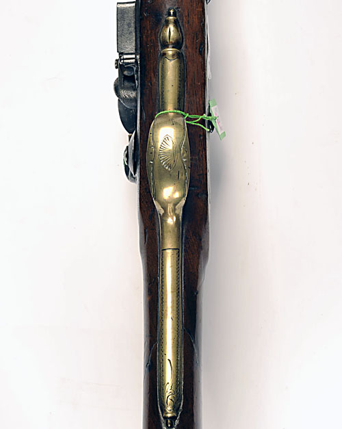 circa 1775, with heavy flaring 17 1/2in. iron barrel (makers details rubbed and illegible), solid plain top-tang, military size curved and radiused pointed-tail lock signed 'ROGERS' (possibly refreshed), plain walnut 'hand-rail' full-stock (cracked and repaired at wrist and left side of fore-end), heavy brass border engraved furniture including serpentine side-plate and rococco escutcheon, heavy radiused border and scroll engraved trigger-guard tangs and bow, brass ramrod thimbles and brass tipped rammer (light pitting to exposed iron surfaces)