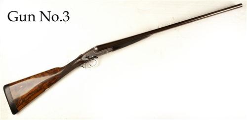 numbers 2 and 3 of a trio, 28in. nitro reproved fine damascus barrels, rib inscriptions indistinct, gold-inlaid '2' and '3',2 1/2in. chambers, choke inserts approx. 1/4 and 1/2 (No.2) and imp. cyl. and 1/4 (No.3), wall thicknesses below recommended minimum;