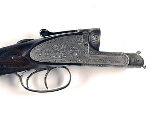 30in. nitro barrels, rib engraved 'TRULOCK & HARRISS. 9. DAWSON ST. DUBLIN.', 2 1/2in. chambers, bored approx. true cyl. and full choke, treble-grip action with removable striker discs, automatic safety, slender toplever, very fine bouquet and scroll engraving with stylised scrolling foliate borders, retaining traces of original colour-hardening and finish, 15in. well-figured stock including 1/2in. wooden extension and horn buttplate, weight 6lb. 12oz., in a lightweight brass-cornered leather hammergun case with Trulock Bros. trade label