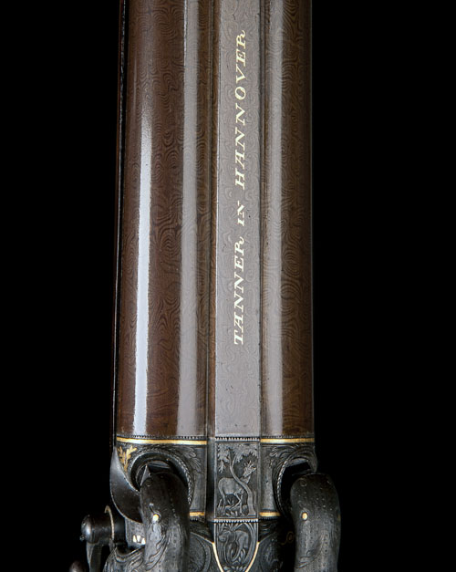 circa 1840, with re-browned 28in. damascus barrels, the top-ribs signed in gold 'TANNER IN HANNOVER', white metal dove-tailed fore-sights, dove-tailed rear-sights, gold floral inlays and lines at the engraved breeches, fully carved and engraved top-tangs featuring various game animals with gold accents and isolated gold framing, border and game-scene engraved back-action locks with some screws and pins framed in gold, carved and engraved hammers with gold accents, swinging safes forwards of the hammers, highly figured semi-pistol grip chequered half-stocks with raised cheek-pieces, fully game-scene engraved iron heel-plates with scroll engraved long top-tangs, circular silver floral engraved escutcheons set into the pommels of the grips, border, scroll and game-scene engraved trigger-guard bows with gold inlays, set-trigger to first barrel, gold oval escutcheons engraved with the crest of Ernst August Elector of Hannover, Duke of Brunswick to the fore-ends, white-metal engraved fore-end caps and original nickel tipped ramrods, much original colour to the metalwork except where noted