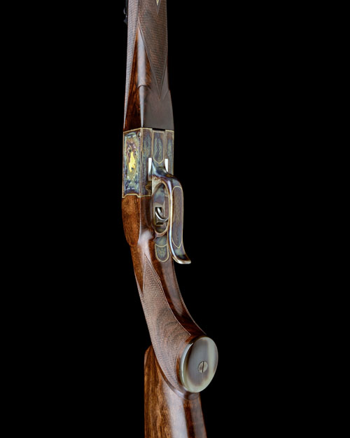 24in. blued round to octagonal nitro barrel engraved 'DAN'L FRASER & CO. CROMARTY. THE BLACK ISLE. SCOTLAND.' and with a Celtic knot at the breech, block-mounted rear-sight with two folding leaf sights, gold-inlaid centre-lines and marked 50, 100 and 150, the standing breech engraved 'DAN'L FRASER & CO.' action engraved with panels of Celtic designs with gold border lines, with central vignettes finely engraved and gold-inlaid of capercaillie and hare, retaining virtually full original colour-hardening and finish, 14 1/8in. highly-figured pistolgrip stock with cheekpiece, variegated horn finial, pistolgrip-cap and buttplate, weight 4lb. 10oz.