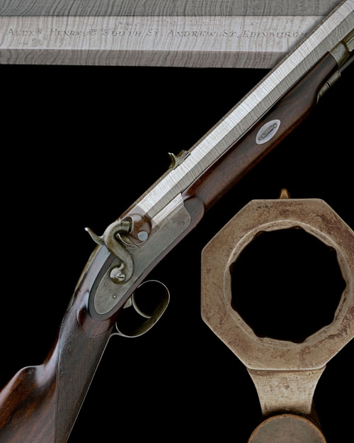 circa 1840, with twist iron slightly swamped octagonal 30in. barrel, the top-flat spuriously signed 'ALEXr HENRY, 8 ST ANDREWS ST EDINBURGH', brass dove-tailed bead fore-sight, standing notch rear-sight with two additional folding leaves, squared patent breech with twin gold-lines and white-metal plug, borderline engraved top-tang, borderline engraved bar-action lock engraved 'ALEXr HENRY', rosewood half-stock chequered at the wrist with oval silver escutcheon, iron heel-plate and trigger-guard, silver oval barrel-key escutcheons, iron fore-end tip and ramrod throat, two iron thimbles and provision for sling, complete with brass mounted heavy duty mahogany ramrod