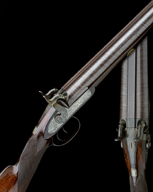 circa 1845, with twist-iron 36in. re-browned barrels, the top-rib signed 'J.C. REILLY, 316 HIGH HOLBORN LONDON', bead fore-sight, scroll engraved rib-end at breech, scroll engraved 'plugs', engraved top-tang, borderline and scroll engraved bar-action locks signed 'REILLY', scroll engraved dolphin-headed hammers, walnut half-stock chequered at the wrist, iron furniture (heel-plate corroded) and brass mounted mahogany ramrod