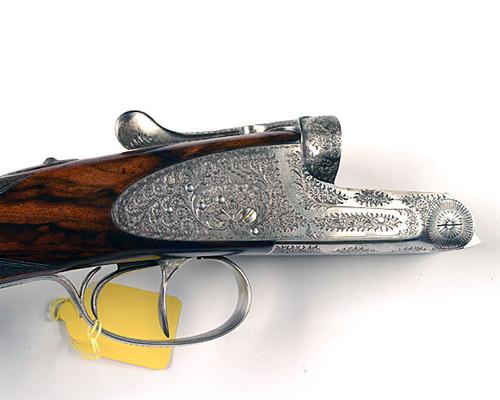 29in. nitro chopperlump barrels with matt rib, 2 3/4in. chambers, bored approx. 1/4 and 1/2 choke, automatic safety with gold-inlaid 'SAFE' detail, removable striker discs, hand detachable sidelocks, gold-inlaid cocking indicators, articulated front trigger, bouquet and scroll engraving, bright finish, 14 3/4in. figured stock including 1/2in. rubber recoil pad, weight 6lb. 9oz.