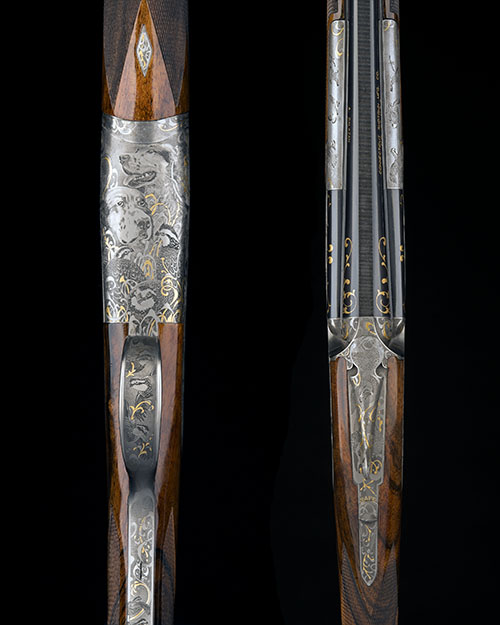 The job of producing the sublime engraving was entrusted to Manrico Torcoli, often seen as the father of 'fantasy engraving'. The talents of this Gardonese craftsman place him as one of the world's finest engravers, but this example is unique being the only gun with this combination of game vignettes and gold-inlay.
