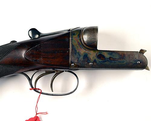 26in. nitro barrels with raised matt sight rib, open sights and two folding leaf sights with silver-inlaid sighting lines and marked for 50, 100 and 200 yards, ramp-mounted bead fore-sight, sunken rib engraved 'WESTLEY RICHARDS & CO. LONDON.', tubes engraved 'W.R. .577 H.V. CARTRIDGE. 100/750 GRS.', large treble-grip action with removable striker bars, Westley Richards patent toplever, standing breech engraved 'WESTLEY RICHARDS EJECTOR', automatic safety with blued and gilt 'SAFE' detail, border engraved action retaining much original colour-hardening and finish, 14 5/8in. figured pistolgrip stock with cheekpiece, horn pistolgrip-cap, sling eyes and including 1in. rubber recoil pad, fore-end with Deeley & Edge patent release catch and horn finial, weight 13lb. 15oz.