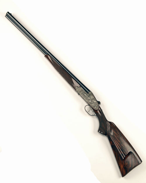 24 3/8in. (62cm) Bohler Super Blitz steel barrels, raised matt rib with filed top and with finely carved floral motifs, central banner engraved 'GLANZNIG - J.P. HAKL - FIREARMS - STOCKHOLM', flip-up open sight and bead fore-sight, 3in. shot chambers, bored approx. imp. cyl. and 1/2 choke, treble-grip action with carved fences, automatic safety, slender side-bolsters, cocking-indicators, set front trigger, the action and furniture carved with acanthus and floral motifs, the lockplates carved in high relief with scenes of jousting roe buck, pheasant and a fox attacking mallard, the underside with a capercaillie, the left lockplate signed 'F. MACK', old silver finish, 14 1/8in. highly-figured pistolgrip stock with sculpted cheekpiece, horn pistolgrip-cap, weight 7lb. 11oz.