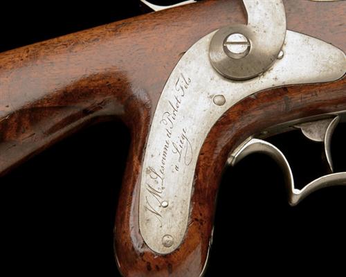 circa 1840, with round tapering 15 3/4in. barrel rifled for Delvigne's Patent expanding bullet, bead fore-sight, octagonal breech-section with elongated top-tang encompassing a click-adjustable notch rear-sight, boomerang-shaped sidelock signed 'N. M. LESOINNE ET PIRLOT FILS A LIEGE', plain hammer, figured walnut half-stock with squared iron heel-plate, bag-shaped pistol grip with iron grip-plate of similar form to the lockplate and lanyard ring to base, asymmetric trigger-guard bow retaining one end of the under-barrel stirrup, double-ended iron ram-rod, iron nose-band to fore-end, brushed bright finish throughout