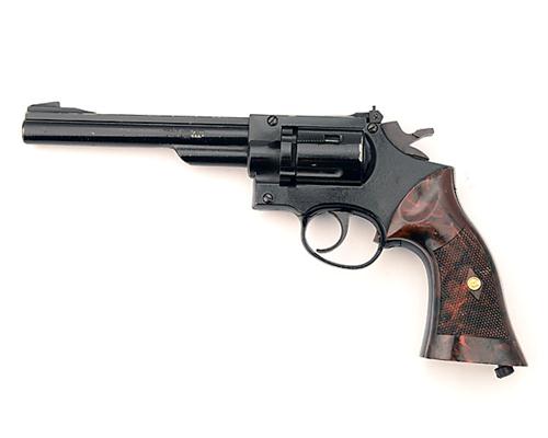 THREE CO2-POWERED AIR-REVOLVERS SIGNED CROSMAN, MODELS SINGLE SIX AND '38T', the last serial number 081226425, the first circa 1970 and in imitation of a Colt Peacemaker with 4 3/4in. barrel and fake staghorn grips (finish worn), the second in .22 and in imitation of a Smith & Wesson Model 19 with 6in. barrel, the last, similar but .177