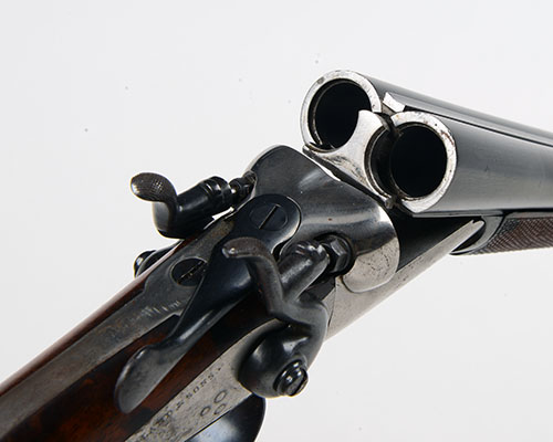 circa 1918, with re-blued 9 1/2in. nitro barrels, the top-rib signed 'THOMAS BLAND & SONS, 2 KING WILLIAM STREET WEST STRAND LONDON', brushed bright plain top-lever action, brushed-bright plain back-action locks signed 'THOMAS BLAND & SONS', blacked hammers, chequered full pistol butt with saw-back grip, carved horn grip-cap with central iron lanyard ring and replacement chequered screw-on fore-end (numbered 51632)
