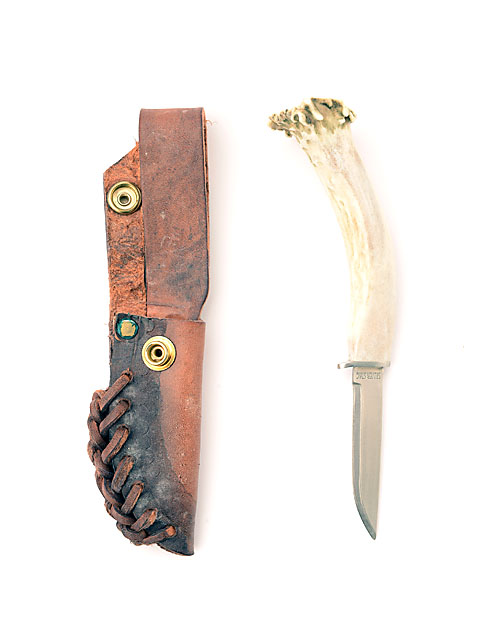 FOUR SILVERSTAG HANDCRAFTED KNIVES, including a 8 1/8 in. stainless steel bladed Pacific Bowie knife with Elk Antler handle, a 3 in. damascus bladed Gamer knife with Deer Antler handle, a 2 1/2 in. stainless steel bladed Mini Patch knife with Whitetail handle and a 3 1/2 in. stainless steel bladed Cascade Hunter knife with deer handle all complete with leather sheaths and manufacturers cartons (4)