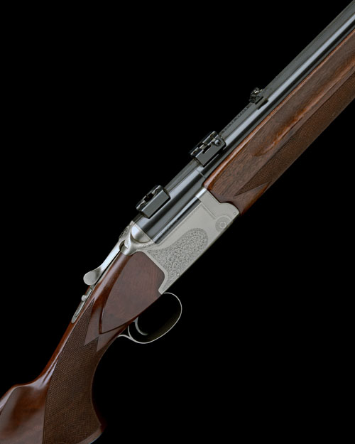 25in. nitro reproved barrels, 8mm stepped raised solid matt top-rib with folding open sights and ramp-mounted bead fore-sight, the breech end with quickly-detachable telescopic sight mount bases, 3in. shot chamber, full choke insert, hold-open toplever, automatic safety with integral barrel selector switch, border and scroll engraving, bright finish, 14 1/8in. figured pistolgrip stock with cheekpiece, monte carlo comb, pistolgrip-cap, sling eyes and including 5/8in. rubber recoil pad, weight 8lb. 10oz.