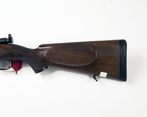24 1/2in. nitro barrel with open sights and two folding leaf sights marked 50, 100 and 150, ramp-mounted bead fore-sight with flip-up moonsight, double square bridge receiver with solid side wall and quickly-detachable mount bases, bolt with peep sight and gold-inlaid 'SAFE detail, recoil blocks, high capacity magazine with hinged straddle floorplate and push button release, blued finish, figured pistolgrip stock with cheekpiece, sling swivels, steel pistolgrip-cap, dark wood finial, 14 7/8in. pull including 7/8in. rubber recoil pad