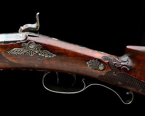 circa 1855, with etched variegated octagonal damascus 33 3/4in. heavy barrel, dove-tailed blade fore-sight, carved dove-tailed rear-sight with interchangeable blades, engraved muzzle around the bore, scroll engraved breech-block (rubbed), long scroll engraved colour-hardened top-tang with square socket for aperture sight (missing), colour-hardened scroll engraved back-action lock with an irregular border, the lock signed in gold 'S IUNG' within a banner, provision for hammer safety (missing), colour-hardened scroll engraved dolphin headed hammer, walnut full-stock with rococco bordered carved chequered panels to the wrist and fore-end, colour-hardened borderline and scroll engraved irregular-shaped iron patch-box inlaid to the right hand side of butt, the centre of lid inlaid with a gold running deer, solid silver heel-plate with scroll engraved long heel-spur, silver winged side-nail cups, silver scroll-engraved trigger-guard tang with raised scrolled semi pistol-grip, broad scroll engraved silver trigger-guard bow, double set-triggers, silver vase finial, triple white-metal oval take-down escutcheons, silver ramrod thimbles, horn schnabel fore-end tip and horn mounted wood ramrod