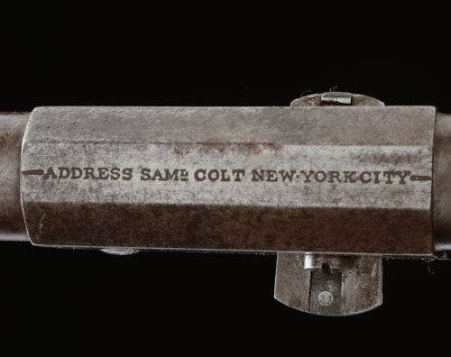 for 1850, round 7 1/2in. barrel with octagonal breech-section, the top signed 'ADDRESS SAML COLT NEW-YORK CITY', nickel fore-sight, rear-sight notch to the hammer-nose, plain cylinder with traces of roll-engraved scene, squared locking notches, open iron frame marked 'COLTS PATENT US' on three lines, brass grip-straps and trigger-guard, smooth walnut one-piece grip and hinged under-barrel rammer, slight traces of finish in sheltered areas