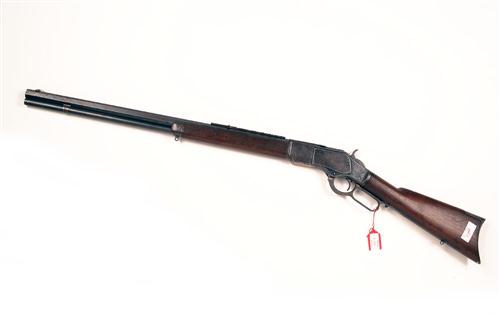for 1896, with octagonal 24 1/4in. barrel signed 'WINCHESTER'S REPEATING ARMS NEW HAVEN CONN USA. KINGS IMPROVEMENT PATENTED MARCH 29 1866 OCTOBER 16 1860', dove-tailed bladed 'Rocky Mountain' fore-sight, elevating ladder 'Africa' rear-sight with six additional folding leaves, plain receiver with sliding dust-cover, top-tang drilled for peep-sight, fitted with keeper-screws and marked 'MODEL 1873', walnut straight-hand butt-stock with iron crescent heel-plate fitted with sliding central trap-door, single set-trigger, brass cartridge-lifter with calibre designation, plain walnut fore-end, under-barrel full-length magazine, fitted with eyelets for the Winchester sling, the whole with strong traces of original finish