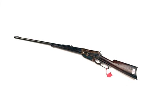 for 1915, with blued 24in. tapering barrel marked 'NICKEL STEEL BARREL ESPECIALLY FOR SMOKELESS POWDERS', matted surface to the nocksform, plain receiver marked 'MANUFACTURED BY THE WINCHESTER REPEATING ARMS CO, NEW HAVEN CONN' together with patent dates to 'August 8 07', the top-tang marked 'MODEL 1895 WINCHESTER TRADE MARK REG IN US PAT OFF', walnut straight-hand butt-stock with iron crescent heel-plate, integral box-magazine beneath the receiver, schnabel splinter fore-end with ebony inlay at tip, the whole retaining a good amount of original finish