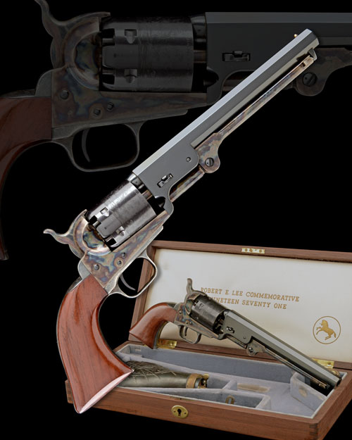 for 1971, with 7 1/2in. blued barrel engraved 'ROBERT E. LEE COMMEMORATIVE - NINETEEN SEVENTY ONE', blued cylinder roll-engraved with naval engagement scene, case-hardened frame, silver-plated grip-strap and trigger-guard, walnut grips, TOGETHER WITH its manufacturers original lined and fitted case with powder-flask, bullet mould, nipple-wrench and cap tin, appearing to be virtually unfired