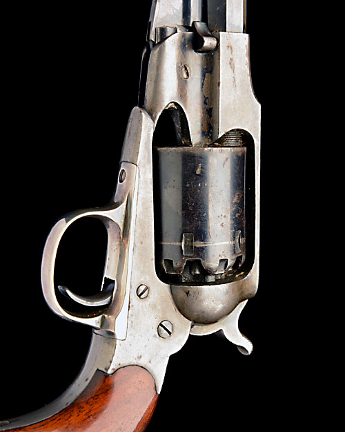 circa 1868, with blued 8in. barrel marked 'PATENTED SEPT 14 1858, E REMINGTON & SONS, ILION, NEWYORK USA, NEW-MODEL', pillar blade fore-sight, sighting groove to the top-strap, plain blued cylinder, solid frame, silver-plated trigger-guard, smooth walnut grips and blued under-barrel rammer, much original finish to barrel and cylinder, frame faded